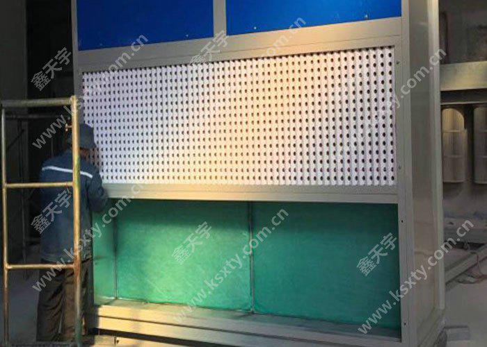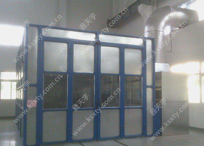干式噴漆室主要由室體系統、新風過濾系統、漆霧處理系統、排風系統、照明系統、有機廢氣處理系統、廢氣檢測系統(可選配)、控制系統等部分組成。棚頂設進風過濾裝置,使進入漆房的自然風得到初凈化。在漆房的棚頂外側裝有防爆照明燈。漆霧過濾系統主要功能是過濾及吸附漆房中的漆霧與溶劑,確保排出室外的空氣質量。排風凈化裝置分兩段,前一段為漆霧過濾裝置,過濾廢漆;后一段采用活性炭吸附。
