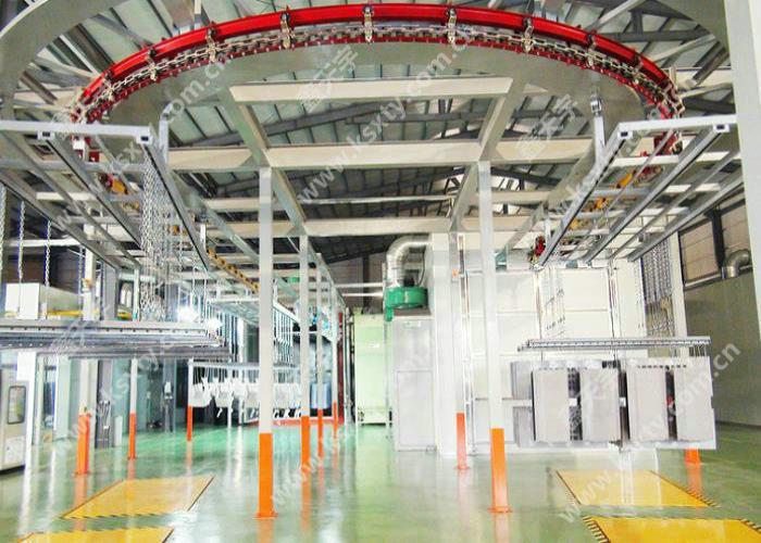 由一條萬向輸送鏈帶動鋁型材以指定的路軌移動, 整條線鏈條長度在 100~150 米,可耐高溫。其運行速度與噴槍數量和噴粉厚度有關, 一般情況下單面十二支噴槍的話輸送鏈運行速度在1.5 ~2m/min。